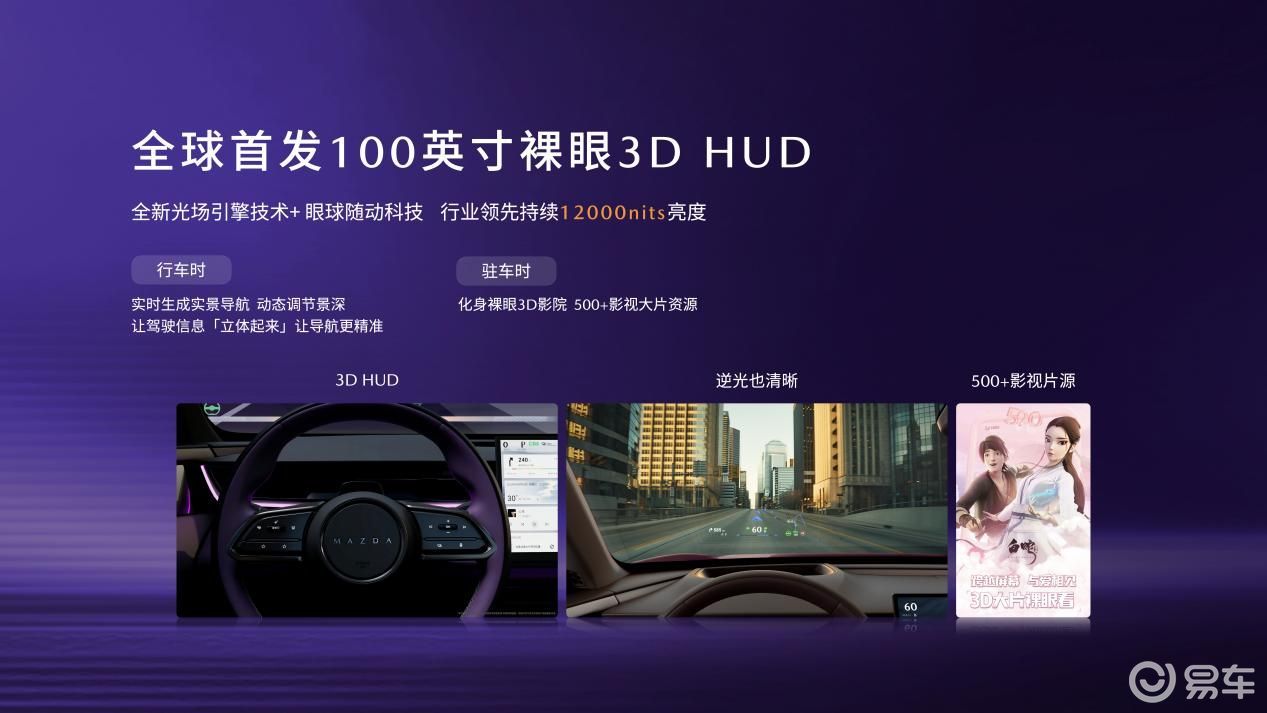 EZ-60还配备了全球首发的100英寸裸眼3D HUD。这项技术通过SLHM空间算法和导航,使信息呈现"分层景深",减少视觉延迟,避免驾驶时分心。眼位追踪功能让画面随眼球移动,解决了HUD"飘、抖、晃"的问题。此外,3D-HUD还可以作为裸眼3D影院使用,提供超过500部3D片源,方便停车休息时观看。