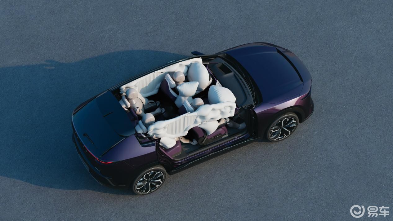 全系标配9个安全气囊,总容积370L,保护面积26500cm²。双腔中央气囊能防止前排乘员在侧面撞击中发生二次伤害,2米超长侧气帘从A柱覆盖到C柱。副驾采用飞跃式气囊,能够在爆炸瞬间避开大屏,避免对乘客造成二次伤害。