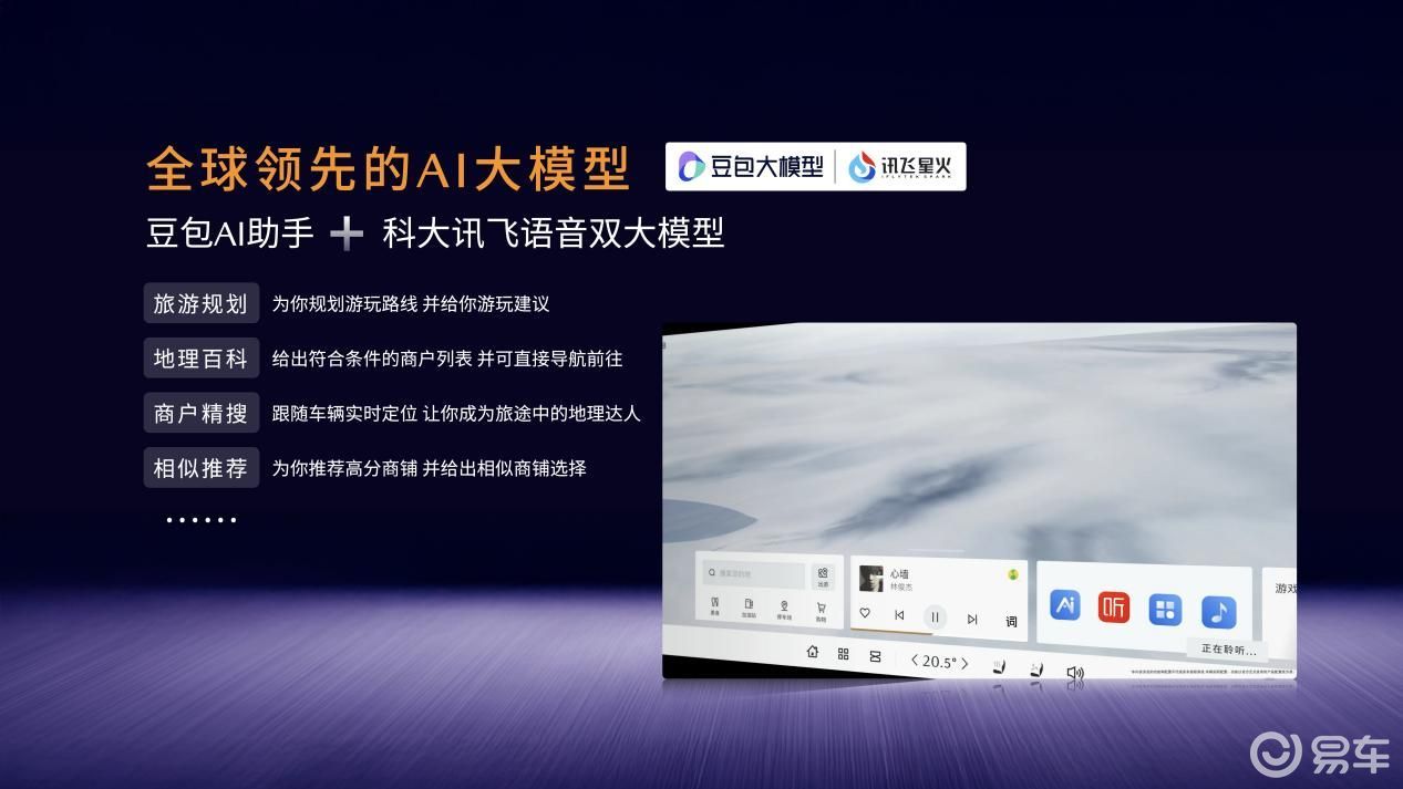 EZ-60的智能系统内置了豆包和讯飞星火两个AI大模型。豆包AI助手可以提供生活建议,讯飞星火则优化了人机交互体验。主驾驶位采用"多模识别"技术,包括唇形检测+声源定位+音区锁定,即使车内播放音乐,也能精准识别指令。