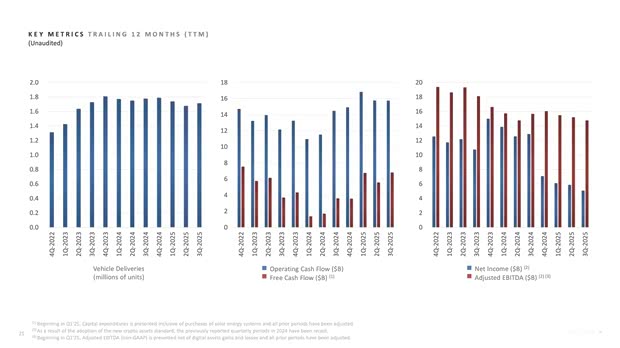营收方面,这一季度,特斯拉收入和自由现金流创下新高,GAAP营业利润为16亿美元,GAAP净利润为14亿美元,非GAAP净利润为18亿美元。营运现金流为62亿美元,自由现金流为40亿美元,现金和投资增加了49亿美元,至416亿美元。