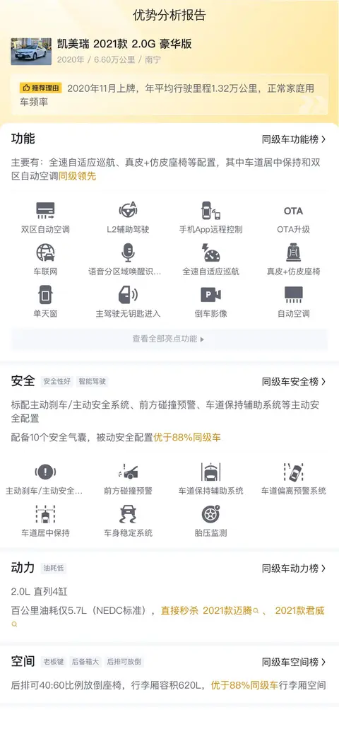 总的来说,凯美瑞2021款2.0G豪华版是一款集优雅、实用于一身的中型轿车,它在二手车市场中以其合理的价格和较低的用车成本,吸引着众多消费者的关注。无论是日常通勤还是家庭出行,它都能提供舒适且稳定的驾乘体验。