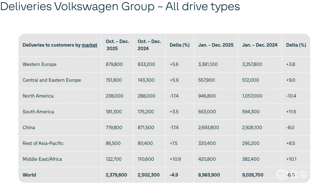 其中不同区域的表现分化明显,大众汽车集团2025年在欧洲市场销量增长4.5%,其中在“大本营”德国增长5.6%,在南美市场销量大增11.6%,北美市场的销量则由于美国的关税局势而下滑10.4%。