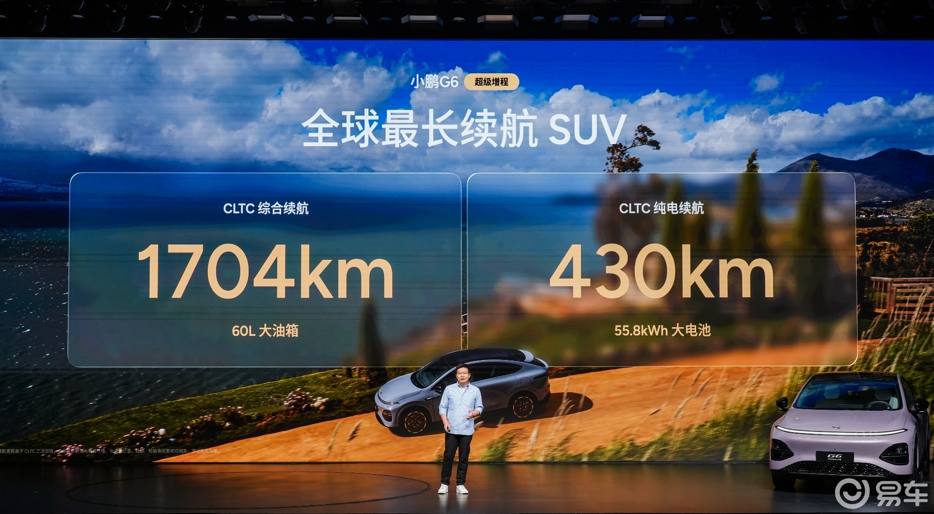 在续航与补能层面,小鹏G6超级增程搭载55.8kWh电池与60L油箱,实现CLTC综合续航1704km、CLTC纯电续航430km,同时配备ENC+RNC双源主动降噪技术与静谧增程器,提升驾乘体验。