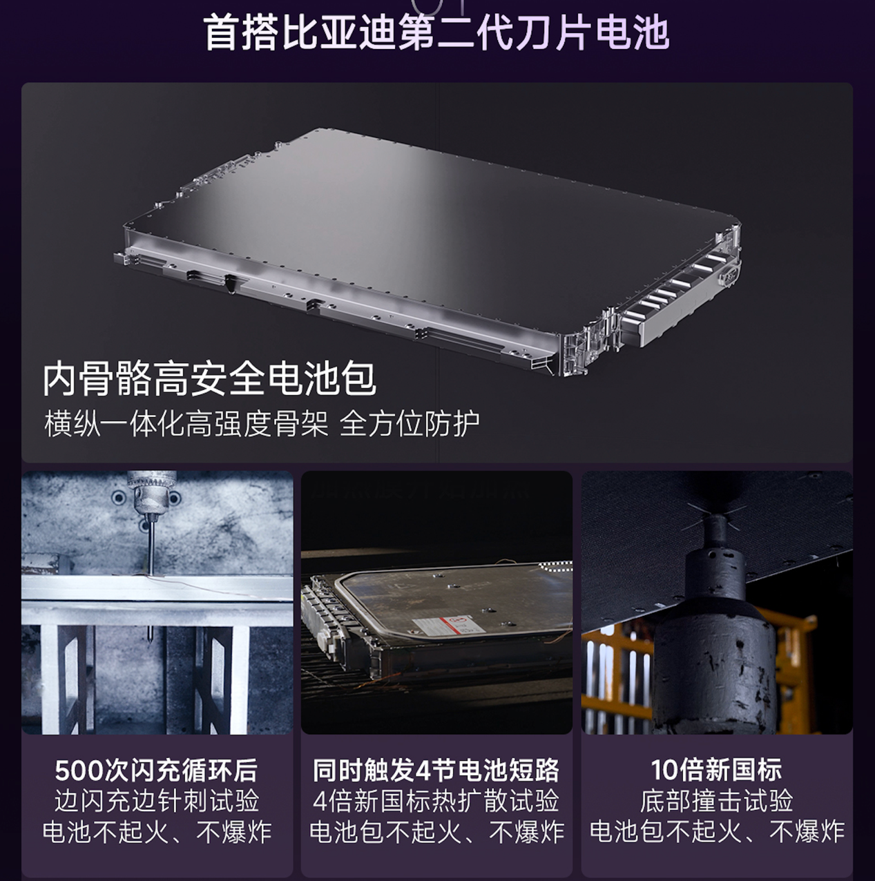 官方测试数据显示,第二代刀片电池通过500次闪充循环后的边充边针刺试验、10倍新国标撞击力的底部撞击试验,以及四节电池同时短路的热扩散试验。不过,电池在长期使用中的安全表现及容量衰减情况,仍有待规模交付后持续验证。