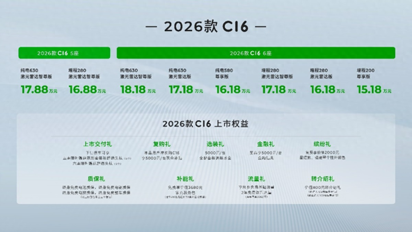 2025年6月18日,零跑汽车正式宣布,2026款零跑C16正式上市并陆续开启全国交付。新车定位“超舒适智能长续航SUV”,基于2024款全面进化,推出“冠军6座”与“全新5座”双版本,以70+项升级、超2.5万元价值进阶,打造“6口之家座座偏爱,5口之选座座超配”的全场景出行体验。新车官方售价区间15.18万-18.18万元,即日起开启预定。