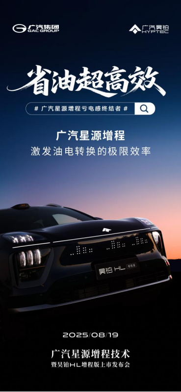 8月19日19:00,广汽星源增程技术即将发布,首搭车型昊铂HL增程版将同步上市。敬请锁定广汽集团、广汽昊铂官方直播间,共同见证这一开创性时刻!